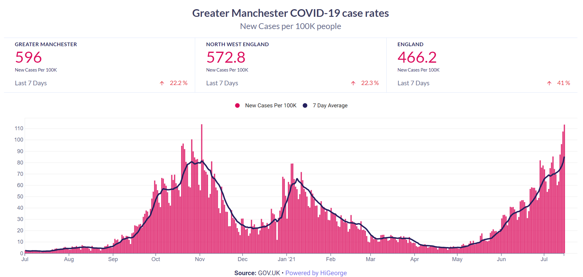 - Case rates: The case rate for Greater Manchester is now 596, up 22.2% in a week compared to England’s rate of 466.2, up 41%. The soaring case rates are overwhelmingly being driven by infections among young people. Oldham’s infection rate is now over 700, the highest rate in GM, followed closely by Rochdale and Wigan which have rates around the 600-mark. Bolton continues to have the lowest rate in the 300s. As our dashboard below shows, daily new cases are now higher than we saw in the January/February wave.