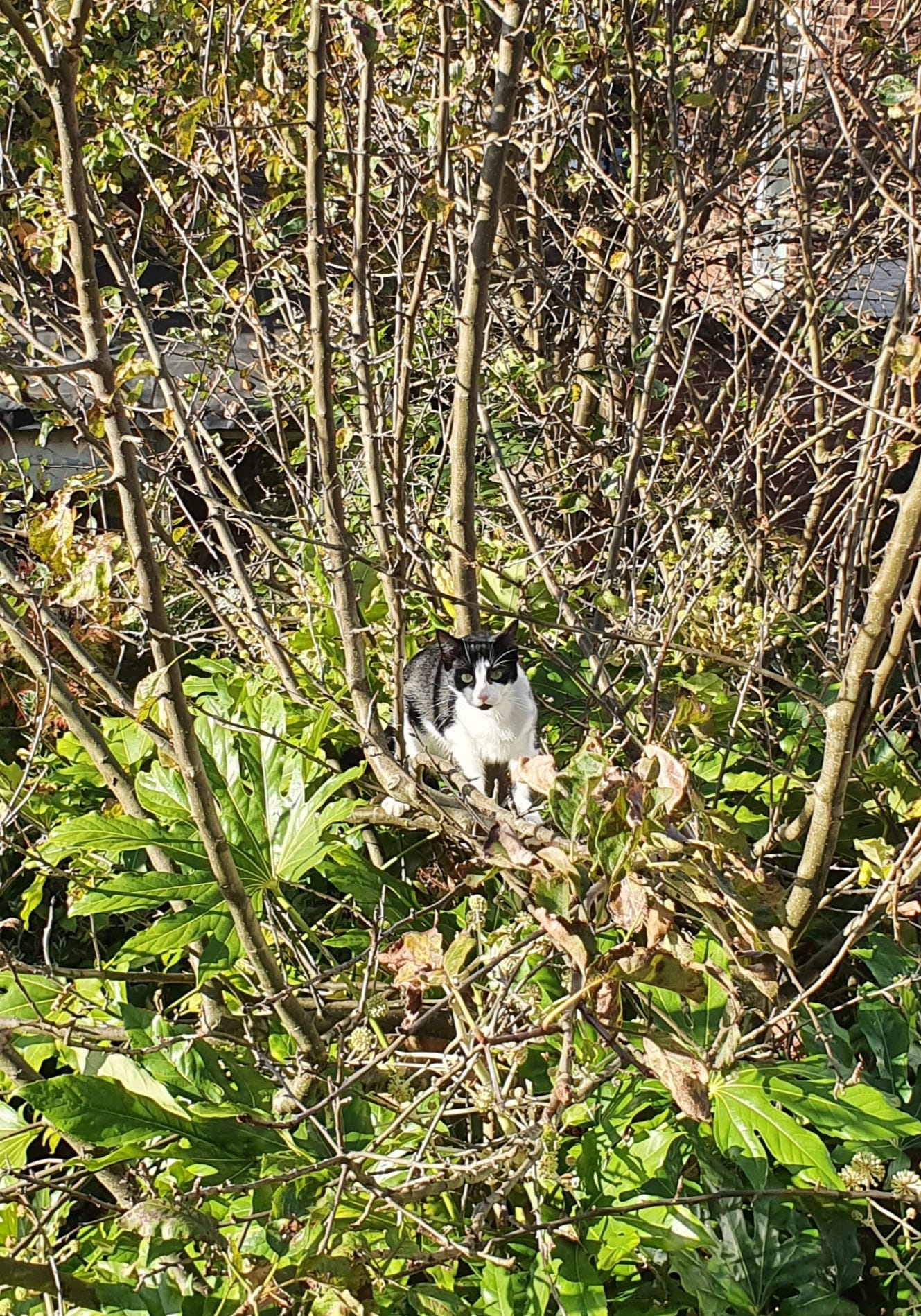 Dear Millers, I hope you’re having a restful weekend. What a beautiful Sunday morning we had. Our cat (she is called Kat) took confidence from the sunny weather and climbed the apple tree in my garden. Here she is, photographed from the upstairs bathroom, looking like she has concerns about where to go next.