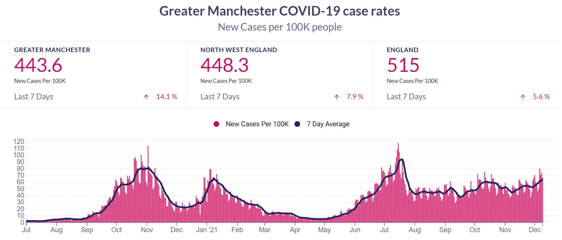 - Vaccinations: 75% of adults (just over 1.8 million people) in GM have now received two doses of a Covid jab. That’s 93% of over-70s, 87% of 50-69s and 65% of 18-49s. As of the beginning of last week, 80% of over-70s in GM had received a booster dose, and 32% of adults had overall.