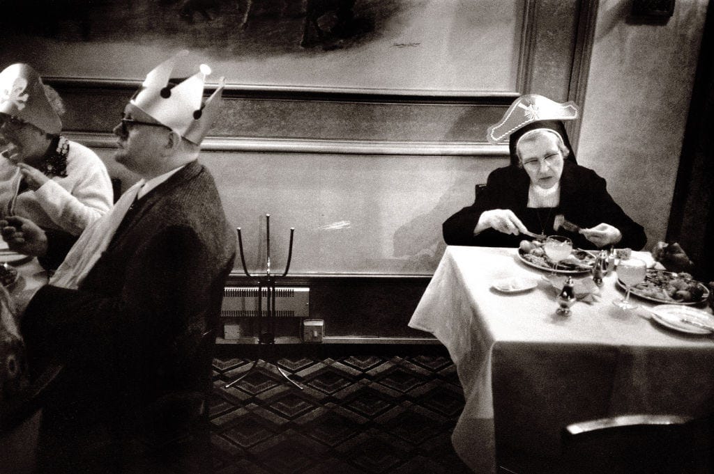 A nun in a Christmas party hat tucks into a festive lunch as she accompanies old folk to a party in Salford, circa 1980. Photo: Martin O'Neill/Redferns.