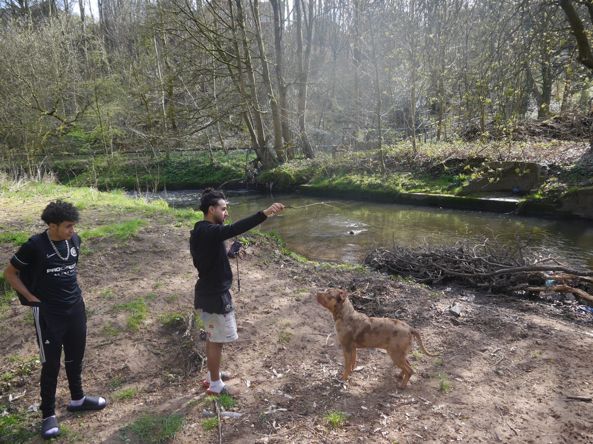 Abid and Iszar, two cousins, are sitting by the River Irk in Crumpsall and throwing sticks for Bullet, an energetic brown Staffordshire terrier, who has decided to ignore them and wrestle a rope buried deep under the riverbed. He growls and they call at him to come back, laughing. The river’s surface is glittering under the sun. It’s idyllic.
