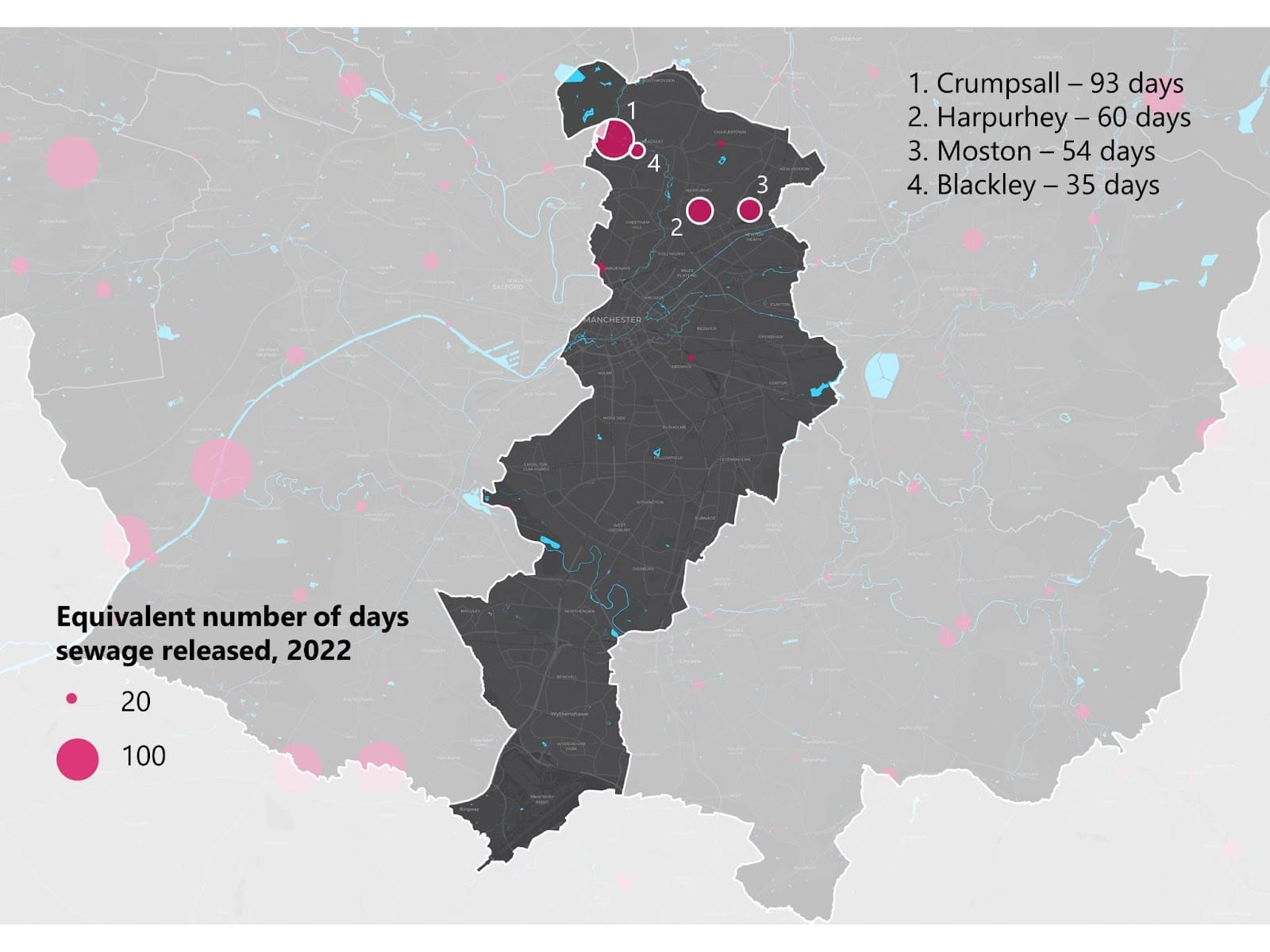 The city’s four biggest sewage leaks are all within three miles’ walk, with 35 days’ worth released at Blackley, 60 days at Harpurhey, and 54 days in Moston. It’s a pretty clear geographical pattern, and while Manchester’s North/South divide is a well-known phenomenon, it came as something of a shock to see it even in the sewage spills data.