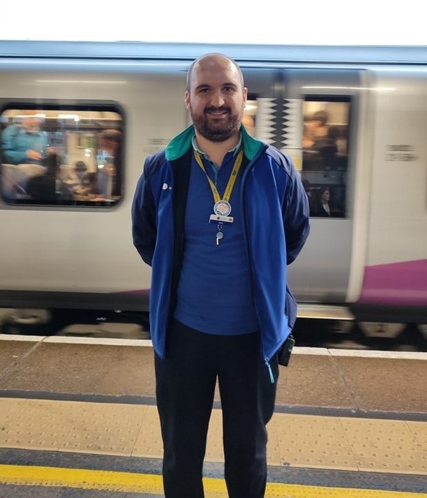 I ask if he has to deal with much aggression from exasperated customers, which he does, but he’s sanguine. “It really doesn’t bother me… I never feel threatened by anyone.” This is perhaps unsurprising, as Mark is roughly seven foot tall. A man in his sixties comes over, asking how to get to Leeds. He’ll need to find some way to Victoria, Mark says, as industrial action has impacted the TransPennine Express trains through here. “Oh well”, he sighs, and wanders off, only to come back a couple of minutes later. “Perhaps I could go to Sheffield first?” Mark shrugs. “Yeah, if you want.”