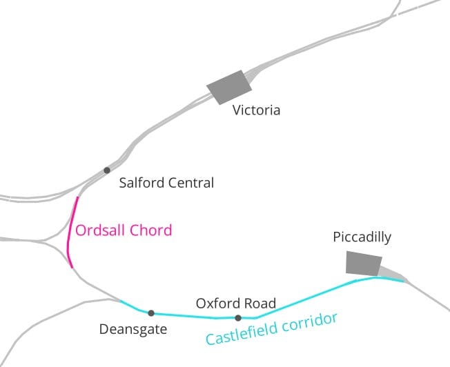 A few years ago, there was – finally – progress, as the city got its first new piece of major rail infrastructure: the Ordsall Chord (pink on the map above).