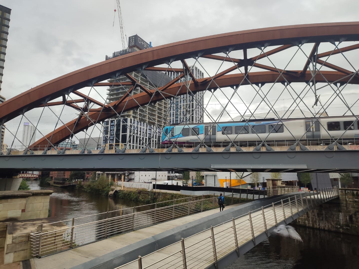 I wander over to take a look. It’s a lovely piece of infrastructure, with a cast iron swoosh and a nice criss-cross with a pedestrian bridge beneath. Castlefield is my favourite bit of Manchester because of all its bridges, with trams, trains, and people shuttling around on different levels. I sit myself down on the Salford side, opposite Aviva Studios, and wait for a train to come.
