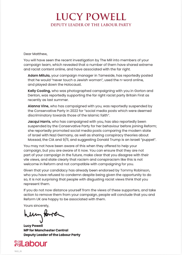 The deputy Labour leader, Lucy Powell, has sent a letter to Matt Goodwin urging him to distance himself from “racist content” shared by his campaign team, following our reporting on Saturday. Our piece, based off research by Hope Not Hate, revealed that members of Goodwin’s team used the n-word, attempted to play down the loss of life in the Holocaust, wrote (in the case of Reform interim campaign manager in Tameside Adam Mitula) that they would “never touch a Jewish woman” and expressed support for the far-right party Britain First. The Guardian also found further Mitula tweets, including one in which he claims there are “Muslim no go ghettos in the UK”. In addition, in response to a post on Black fathers, he wrote: “They are the best in leaving muims [sic] with no support. But those who care about families are very good people.” In the letter, Powell said Goodwin may have been unaware of the comments “when they offered to help your campaign, but you are aware of it now”. She then urged him to “ensure that they are not part of your campaign in the future, make clear that you disagree with their vile views, and state clearly that racism and conspiracism like this is not welcome in Reform and not compatible with campaigning for you”. Jumping to Goodwin’s defence on X, Tommy Robinson claimed Labour had turned a blind eye to “industrial scale rape”, but was now trying to call the people who had attempted to “prevent it” extremists. Quite what record the likes of Mitula have achieved on this front is unclear, nor why it makes making brazenly racist remarks acceptable. Goodwin ignored our, and the Guardian’s, request for comment.