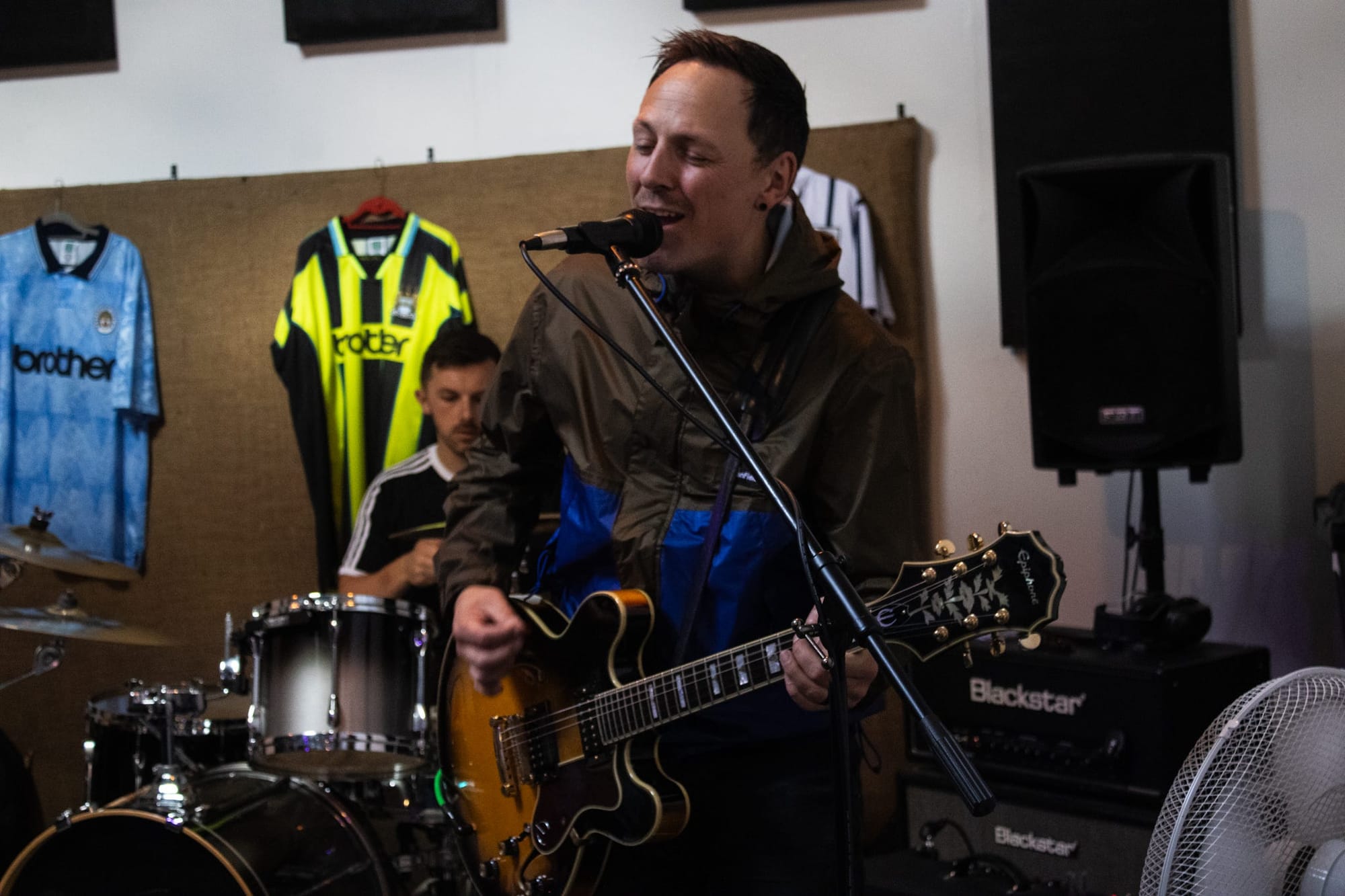 But it doesn’t seem that way when I arrive at the band’s practice studio — a sweltering loft at the top of Hallam Mill in Stockport — for their Friday afternoon rehearsal. BBC World was just leaving as I was coming down the hallway. The walls are studded with Manchester City shirts and wooden beams cross the vaulted ceiling like gallows. Beneath the beams, the band plays Rock ‘n’ Roll Star, sweating in green parkas and outdoor jackets in the heat.