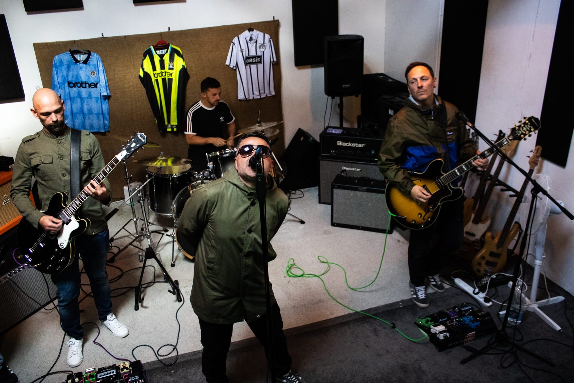 Whatever Oasis are unique in that they are the only tribute act on the circuit whose members are almost all from Manchester. Pete, Andy and Adam are from Stockport, and grew up not far from Burnage, where the Gallagher’s also grew up. They believe this speaks to their authenticity. The band’s regular Liam, Darryl, is from Denton. He couldn’t make it to rehearsal yesterday, or to the BBC interview (“his boss is a twat”), so Chris was drafted in. They work various jobs when they aren’t onstage: Pete and Andy in IT (though Peter has recently quit to become a session musician), while Darryl works at a factory making car polish and bassist Adam Grainger is a children’s entertainer who also hosts after school science clubs. “And I do some karaoke too,” he says, without elaborating. “Between all that, I can just about make a living.”
